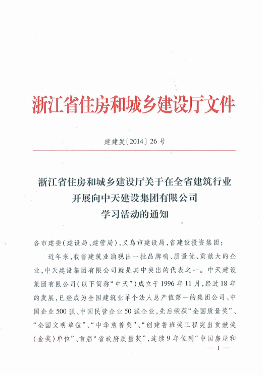 《浙江省住房和城乡建设厅关于在全省建筑行业开展向尊龙·Z6建设集团有限公司学习活动的通知》